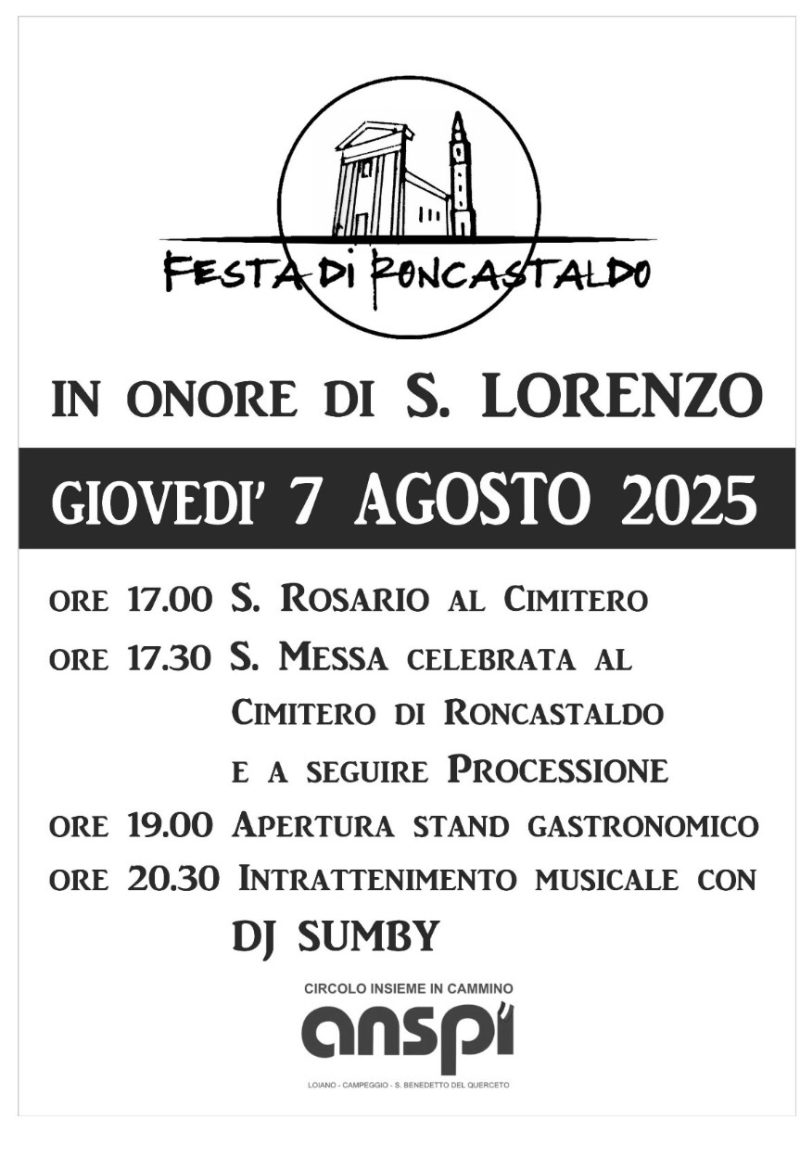 28 Luglio 2025 FESTA Di RONCASTALDO lunedì 7 Luglio Descrizione: FESTA Di RONCASTALDO Data: 07/07/2025 Categorie: Zona Pastorale