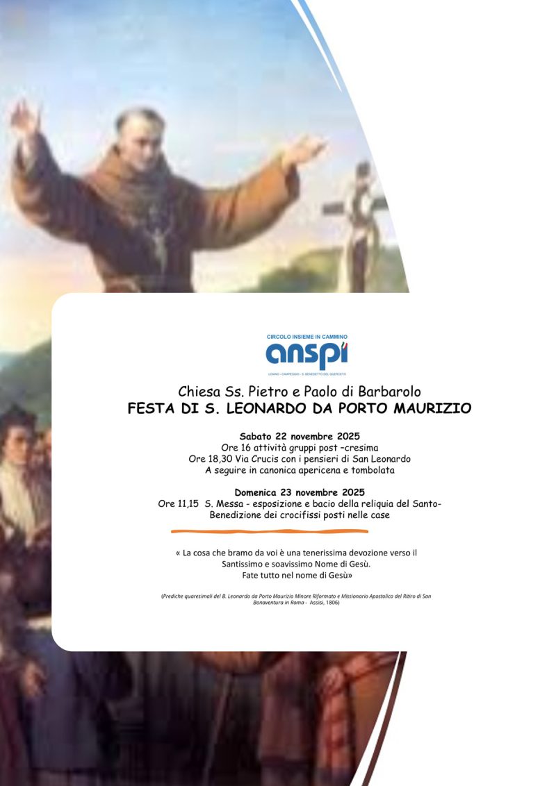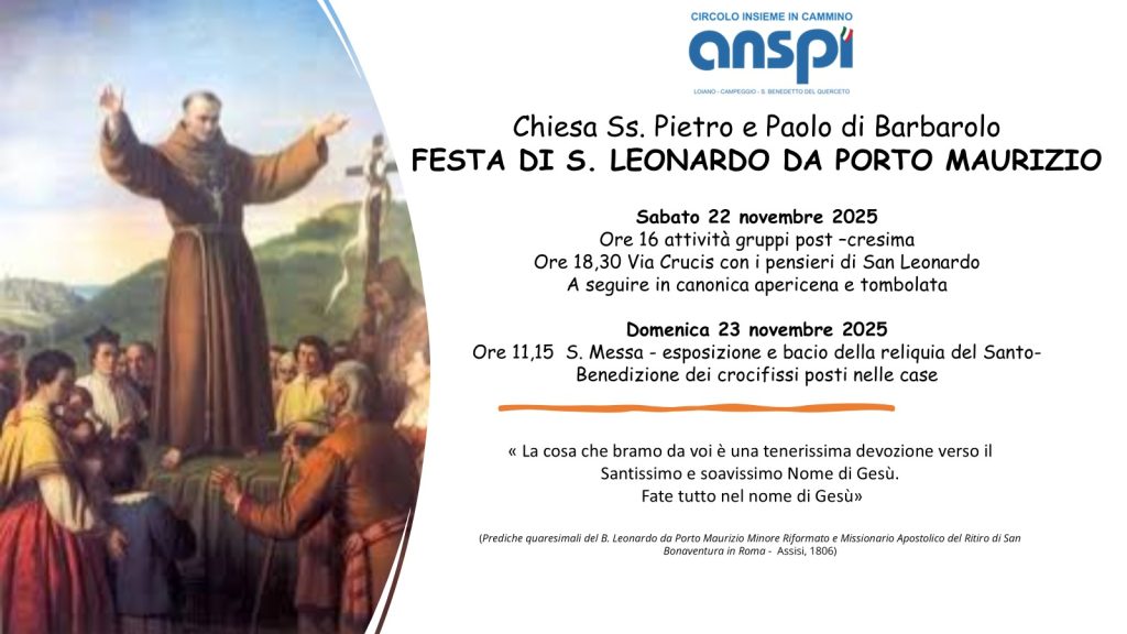19 Novembre 2025 Festa di S.Leonardo da Porto Maurizio sabato 22 Novembre Descrizione: Inizio: 22/11/2025 16:00 Fine: 23/11/2025 12:00 Categorie: Zona Pastorale
