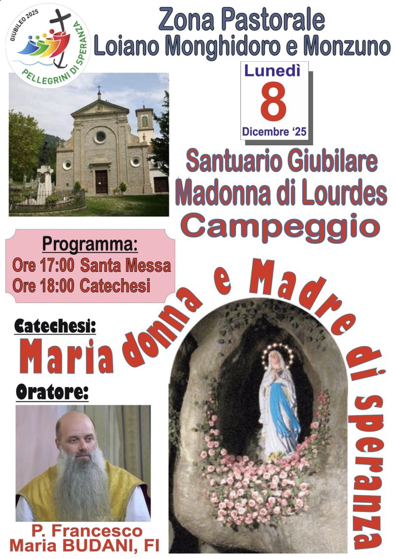 19 Novembre 2025 Maria donna e Madre di speranza Screenshot lunedì 8 Dicembre Descrizione: Zona Pastorale Loiano Monghidoro e Monzuno Lunedì 8 Dicembre 25 Santuario Giubilare Madonna di Lourdes – Campeggio Inizio: 08/12/2025 17:00 Fine: 08/12/2025 19:00 Categorie: Zona Pastorale