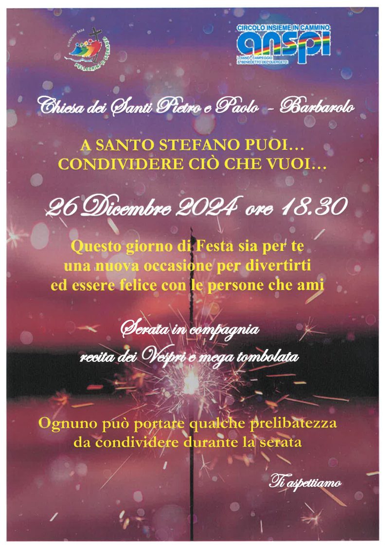 13 Dicembre 2024 Santo Stefano giovedì 26 Dicembre Descrizione: Santo Stefano 2025 A SANTO STEFANO PUOI… CONDIVIDERE CIÒ CHE VUOI… Data: 26/12/2024 Categorie: Zona Pastorale